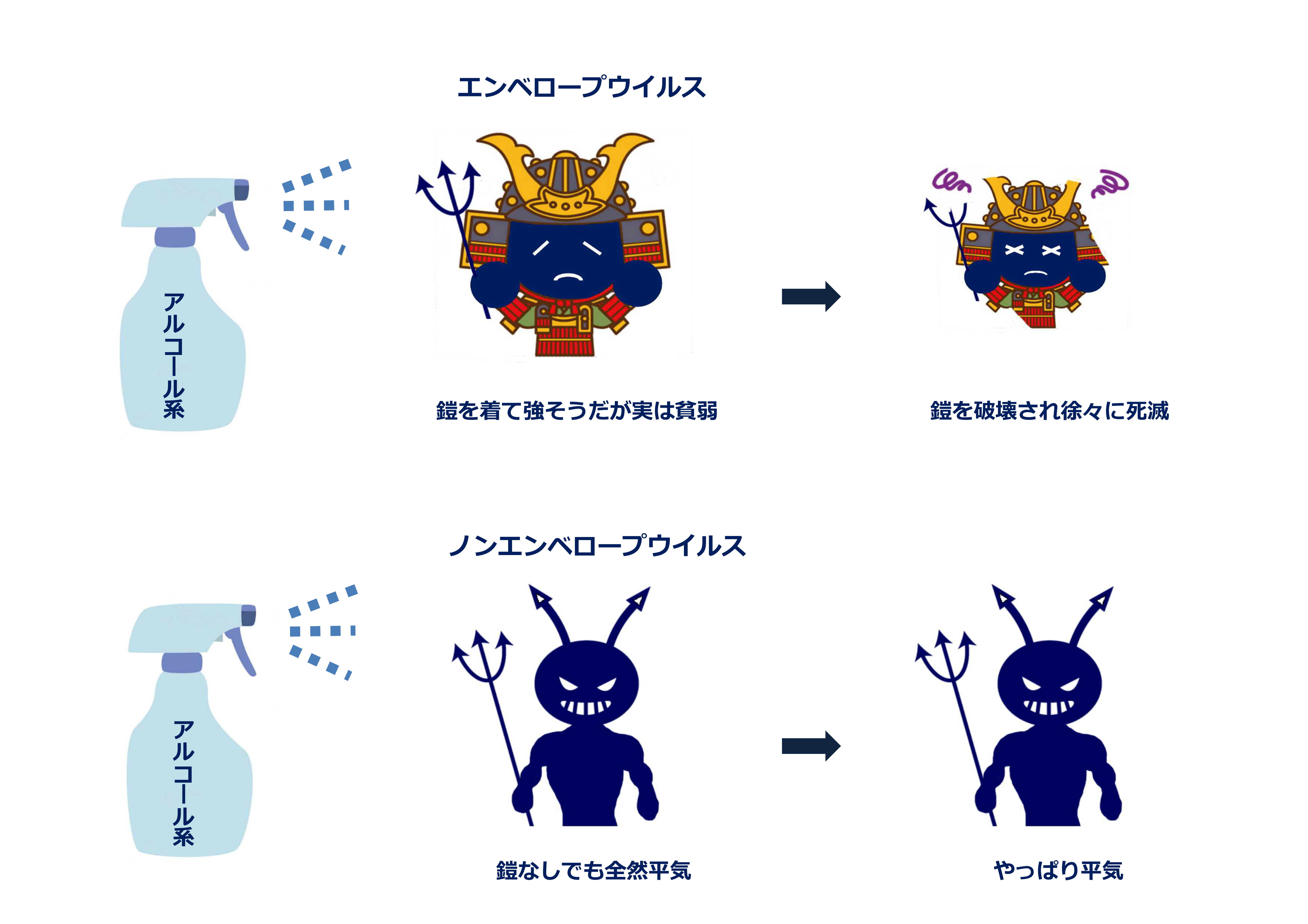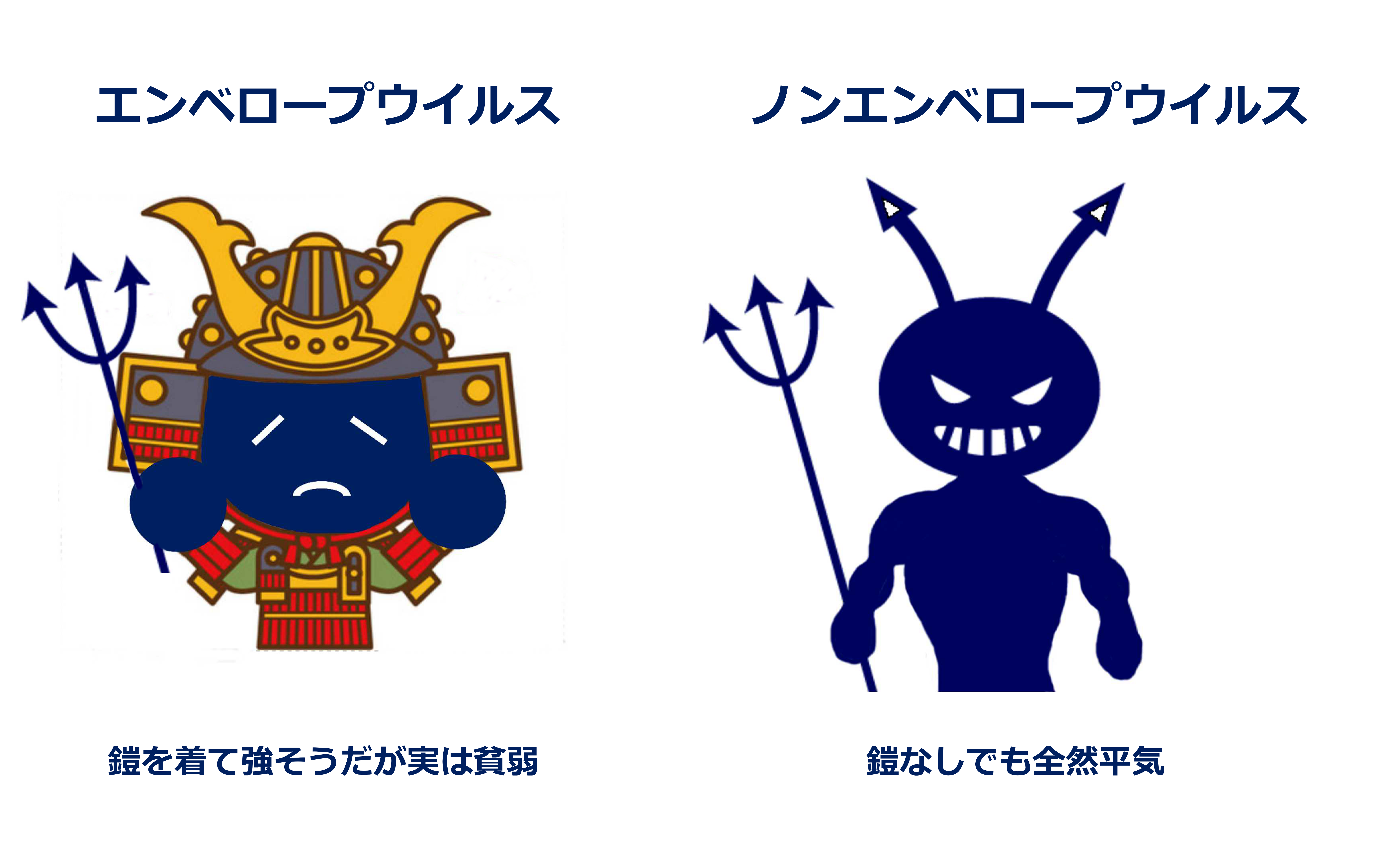 どちらのウイルスが強いのか?と言いますと、意外な事に鎧をまとっていないノンエンベロープウイルスです。理由は単純です。鎧をまとうのは本体が弱いからです。ですから鎧さえはぎ取ってしまえば中のウイルス本体は簡単に死滅します。