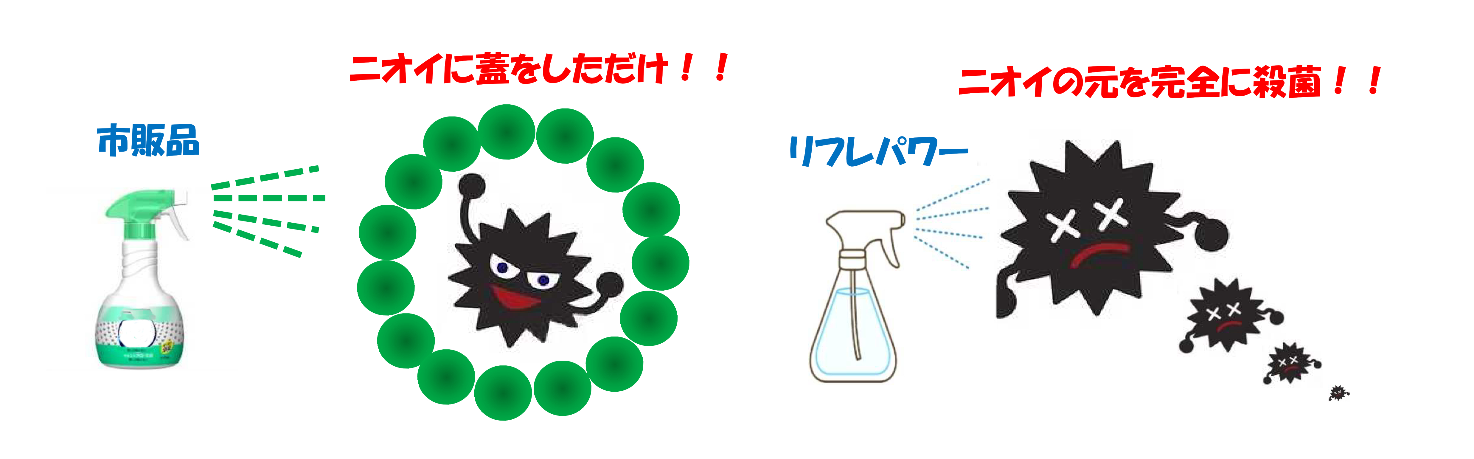 一方リフレパワーOXは一切芳香剤を含みません。マスキング効果ではなく、臭いの元を分子レベルでバラバラに分解して無臭化にしますので臭いの元を残しません。