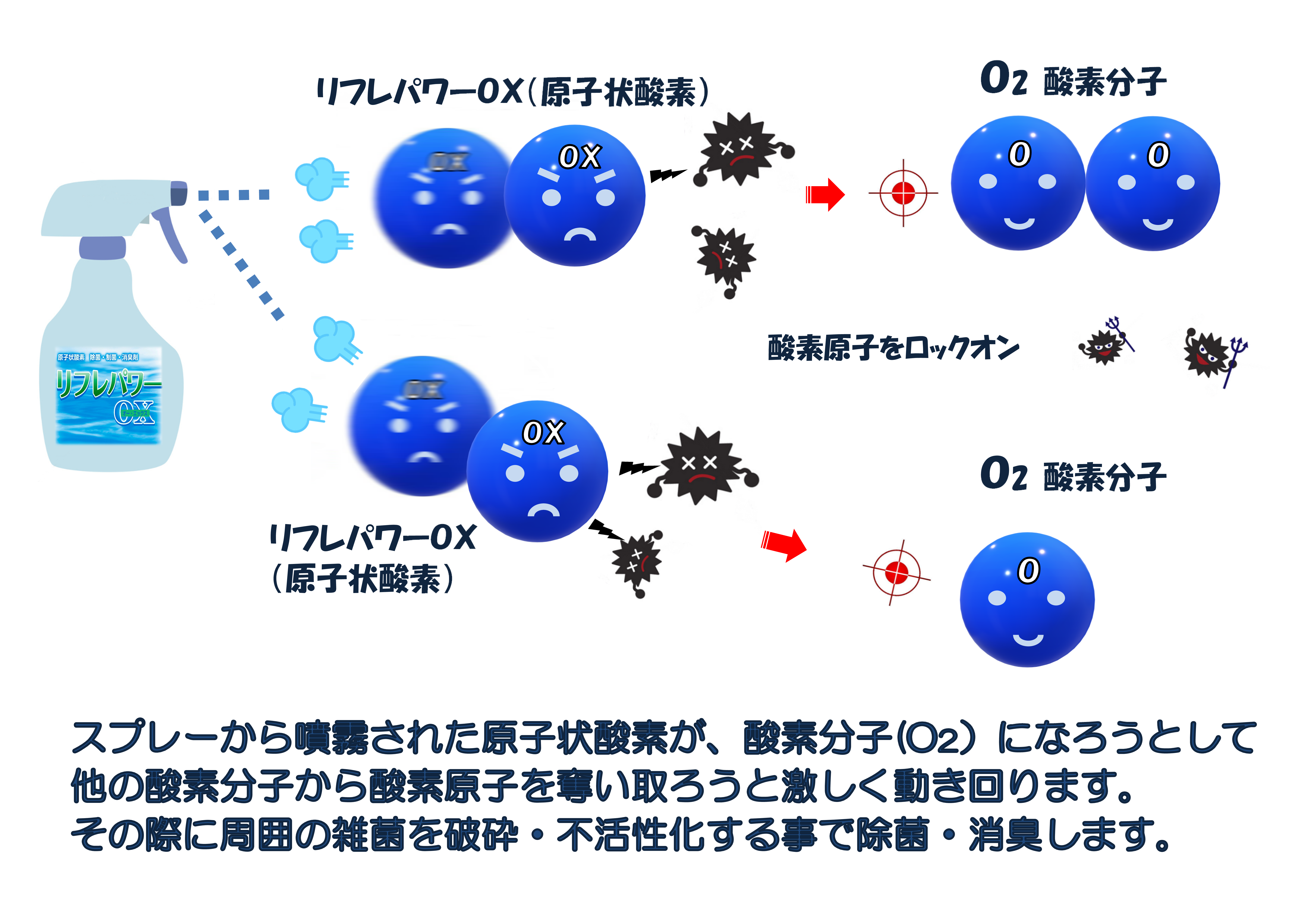 リフレパワーOXは、自然界に存在する酸素の仲間『原子状酸素』の特性を利用して、あらゆるウィルスや細菌を瞬時に細胞レベルで破砕し活動をできなくさせます。同時に、臭いの元を分子レベルに分解して無臭化します。