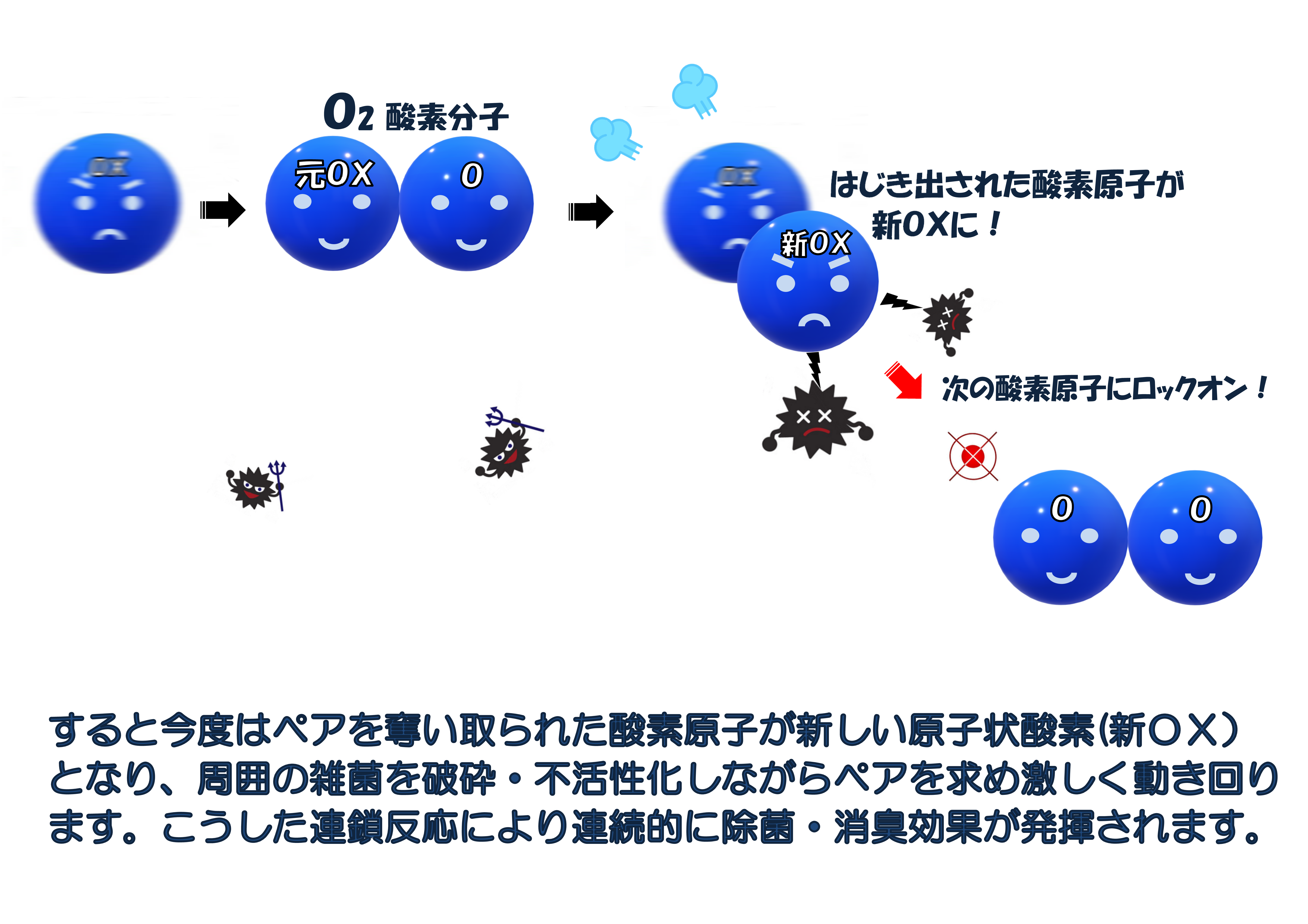 酸素は通常2個の原子が結合し酸素分子を作っていますが、原子状酸素は原子1個(オゾンは3個)の状態です。強力な酸化力で確実な作用力を持ちながら、反応作用後は水と酸素に戻るため有害物質をつくらず人体や自然環境に無害です。