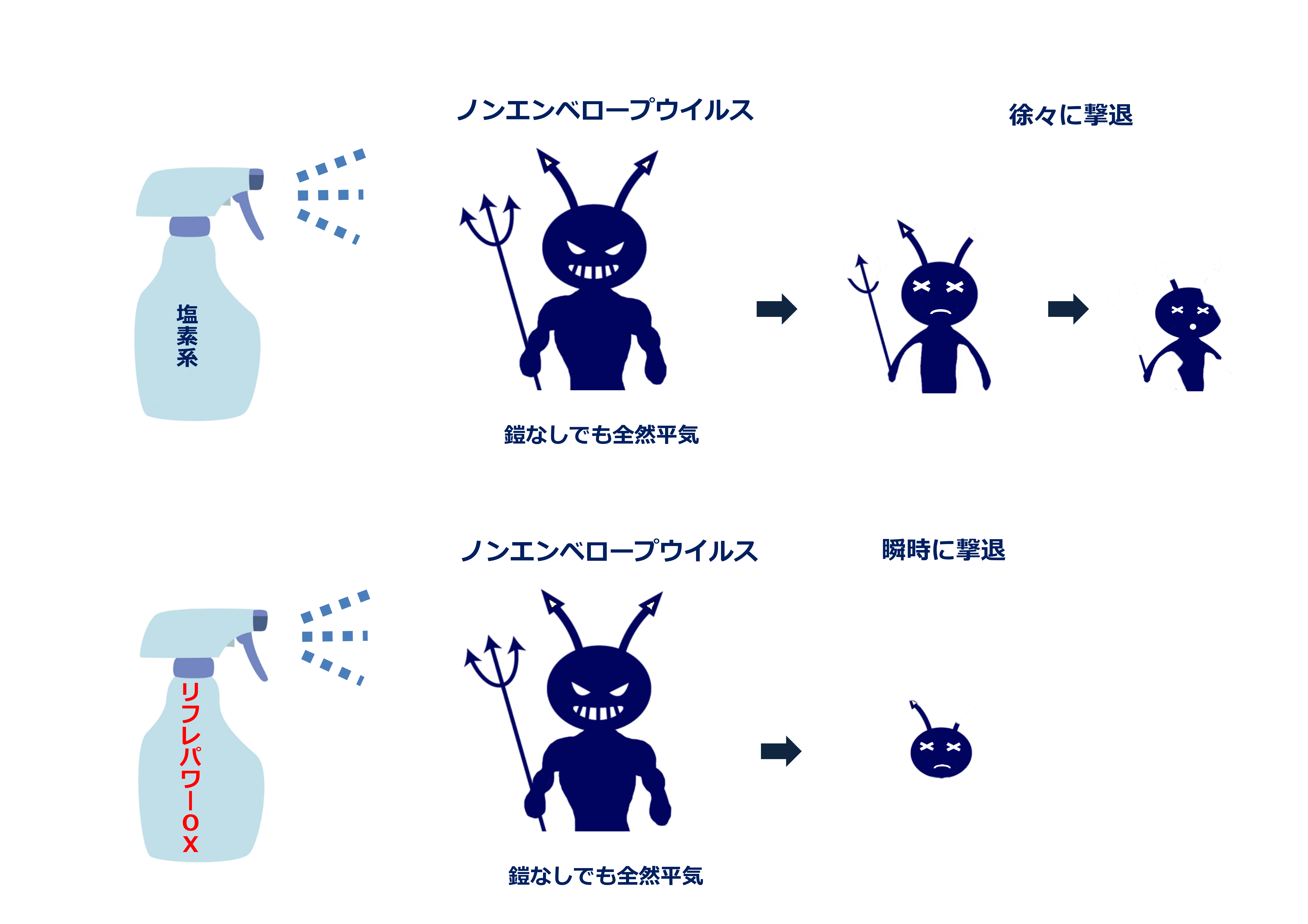 この厄介なノンエンベロープウイルスに効果的なのが、リフレパワーOXと次亜塩素酸水です。