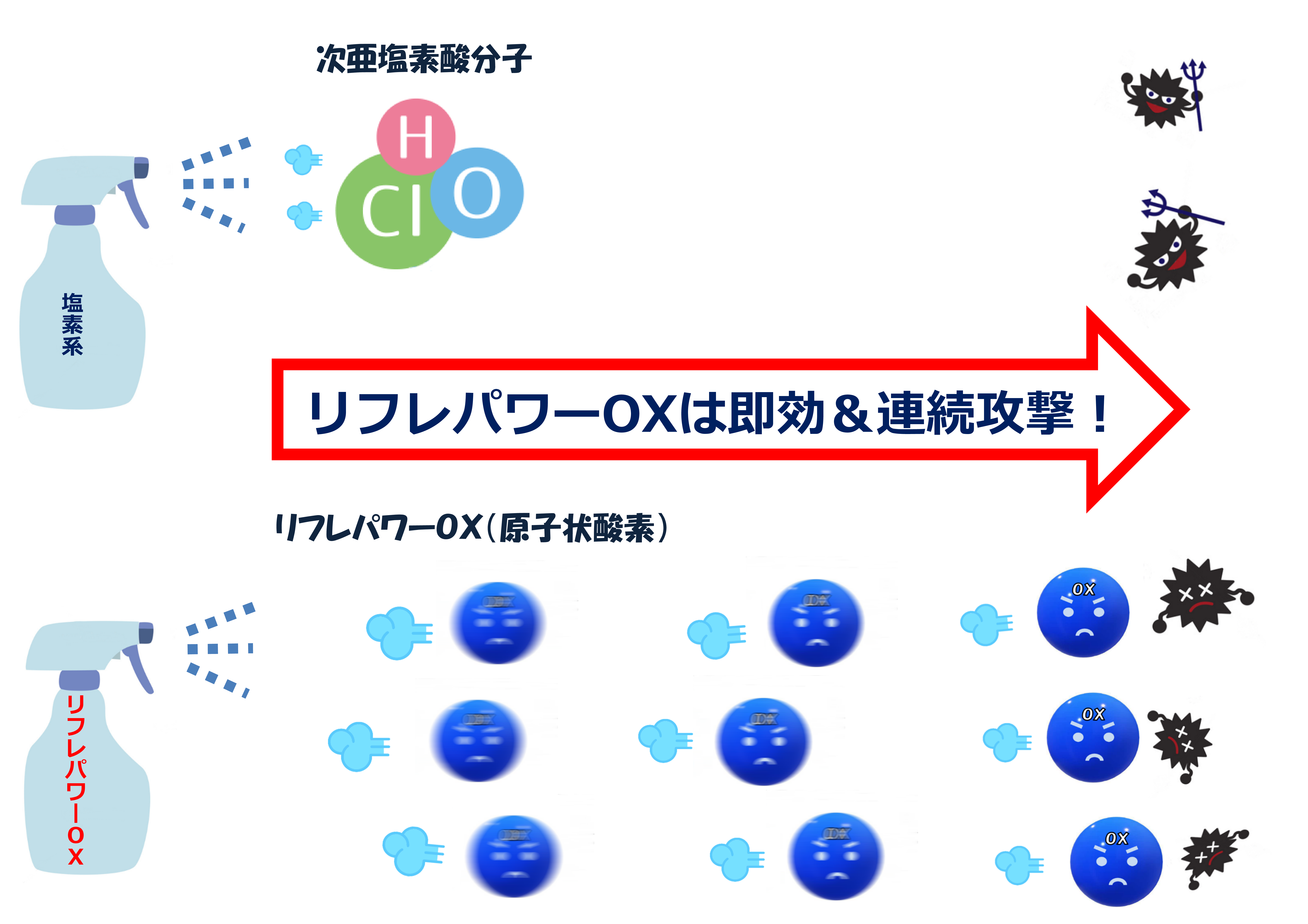 ですがリフレパワーOXに使われている原子状酸素の特性は、連鎖反応により連続的に除菌効果が発揮されますので(前述の「除菌・消臭効果の仕組みとは?」参照)効果の持続性においても勝っています。